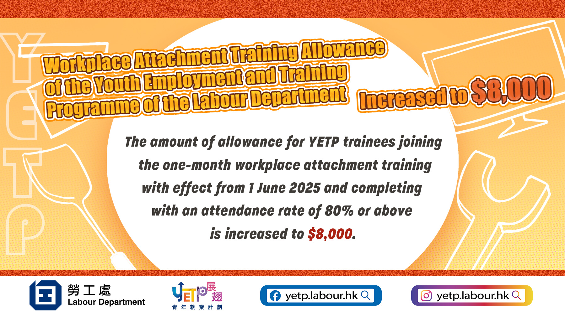 To further encourage young people to acquire practical work experience, develop potentials and explore employment opportunities through workplace attachment training under the Youth Employment and Training Programme (YETP) of the Labour Department, the rate of workplace attachment training allowance is increased with effect from 1 June 2025.